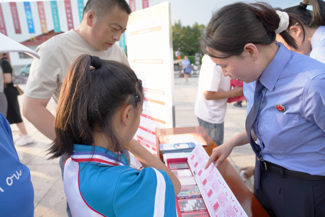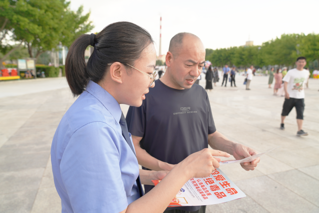 “大家看这是新型毒品的样子,日常生活中我们很容易忽略它……”“解吸食笑气的危害是……”“如果大家发现有人贩卖、吸食毒品举报电话是110……”活动中,宣传人员通过悬挂条幅、现场讲解、发放法治宣传文创礼品向群众普及禁毒相关知识和法律法规。