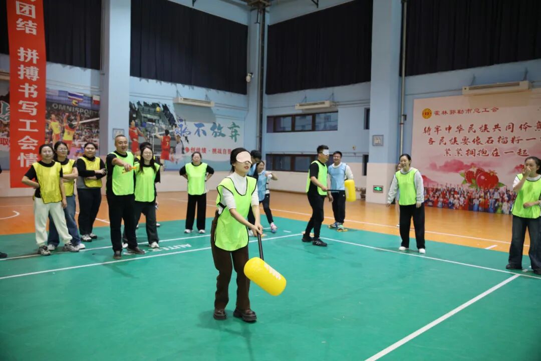 “左边!左边!再往前一点!”“不对,你走反了!”场上蒙眼的队员张开双臂四处摸索;场下的指挥急得跳脚。突然,“嘎——”的一声尖叫划破长空,不知是谁幸运地踩中了目标,引得全场笑声雷动。