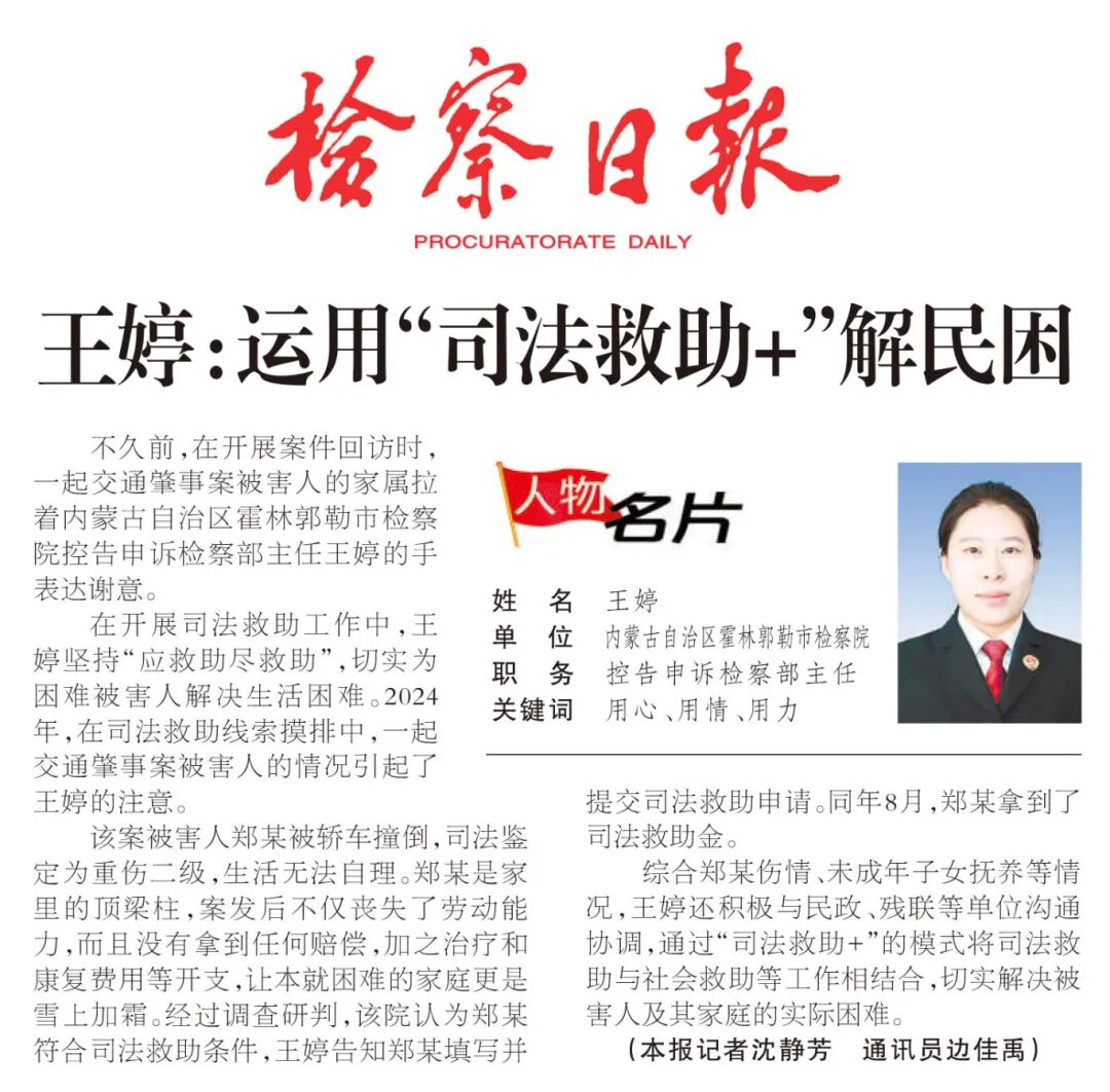 不久前,在开展案件回访时,一起交通肇事案被害人的家属拉着内蒙古自治区霍林郭勒市检察院控告申诉检察部主任王婷的手表达谢意。